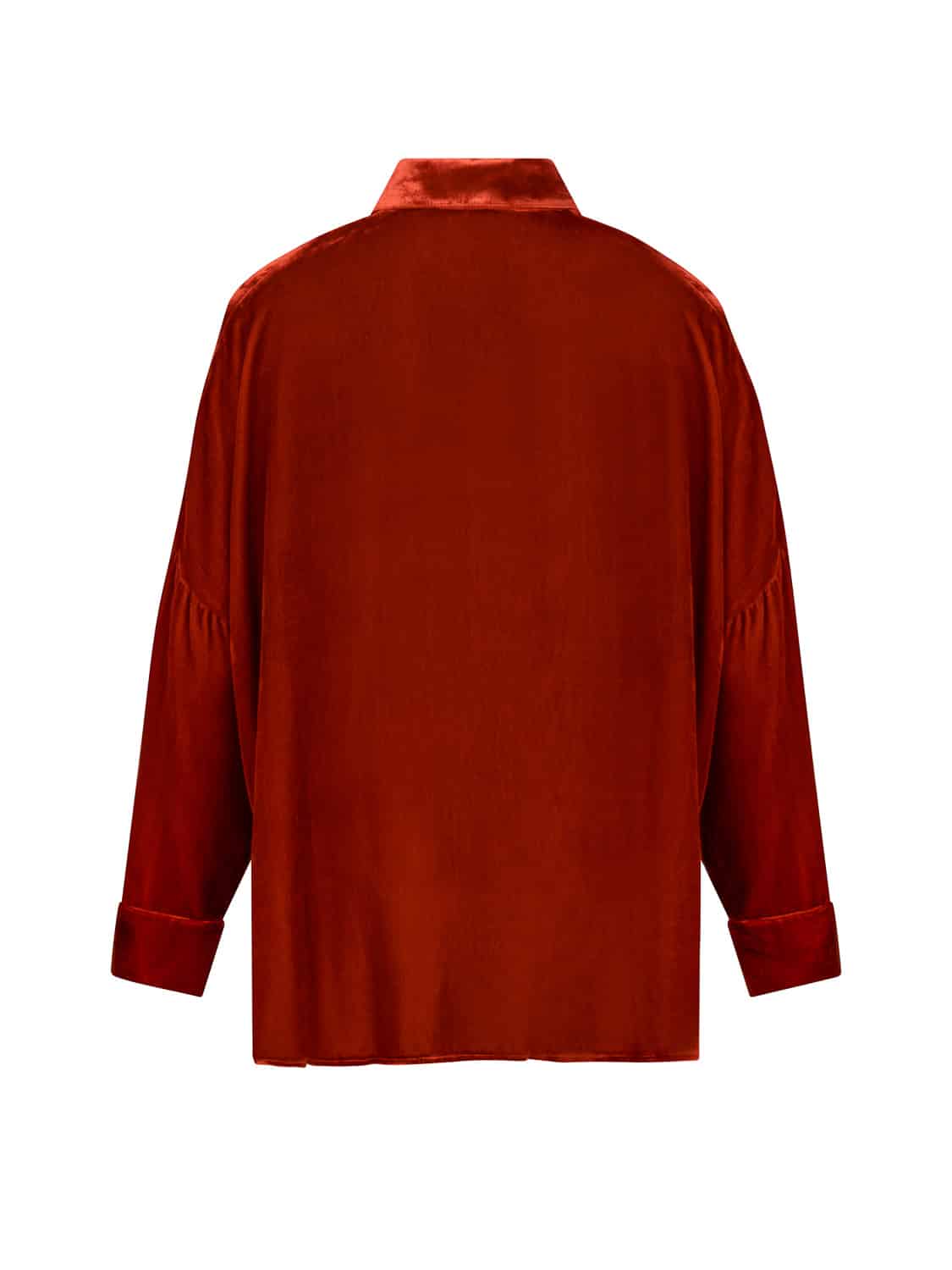 The Gaby shirt is cut like a classic button-down shirt and has a relaxed silhouette that expresses the paradox between masculine and feminine accents. Its clean, square design is shaped from velvet fabric that is soft on the skin. As a witness of its femininity, the rounded edges and side split softened the masculine cut.