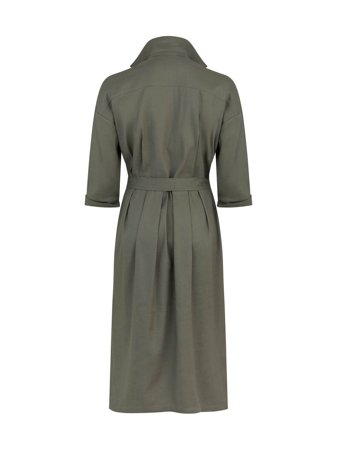 This midi-length dress features utility pockets and a self-tie belt, blending functional, uniform design with refined style. Perfect for warm days or layered cool evenings, it transitions seamlessly from city streets to countryside escapes—pair it with sandals or ankle boots for an easy, polished look.