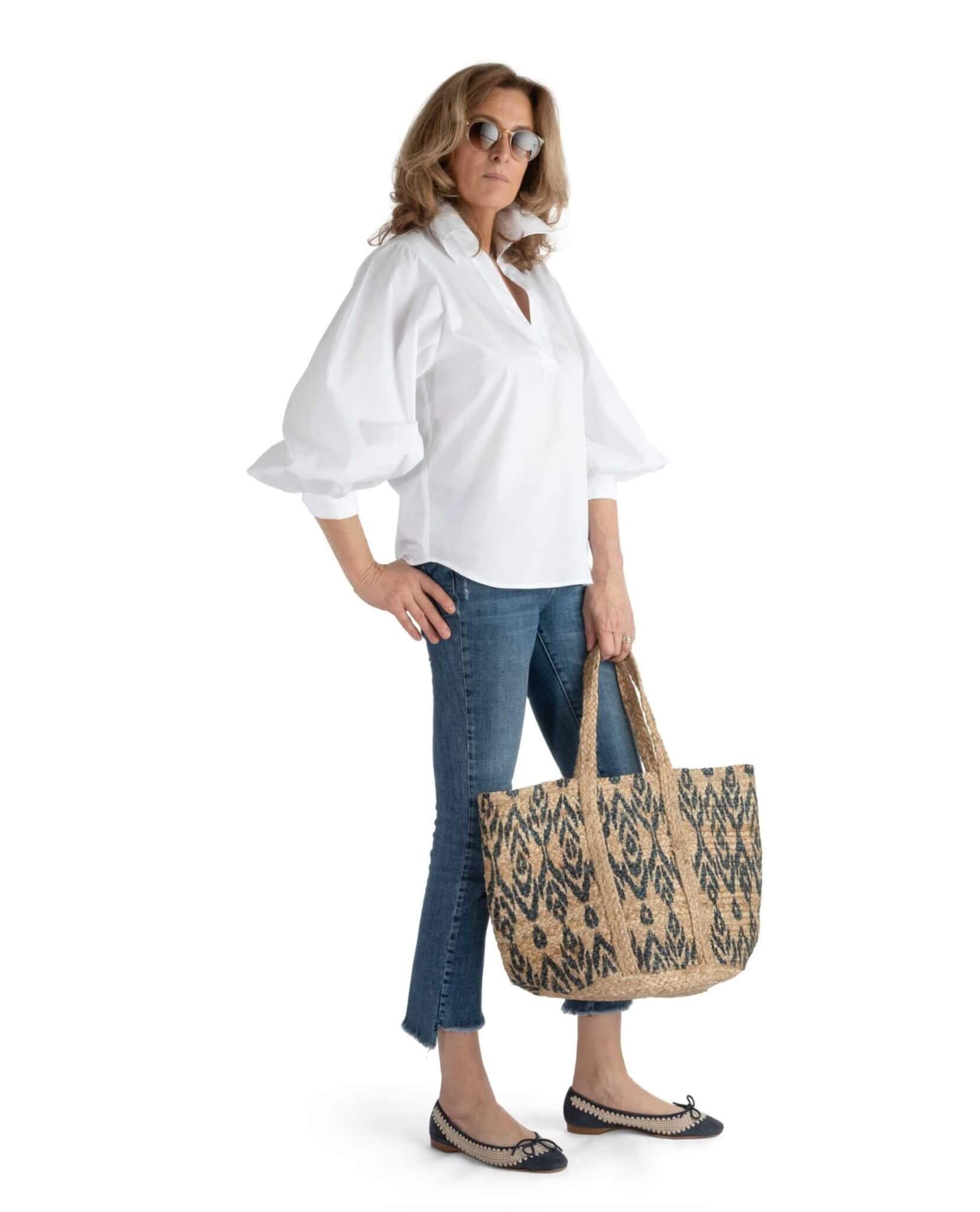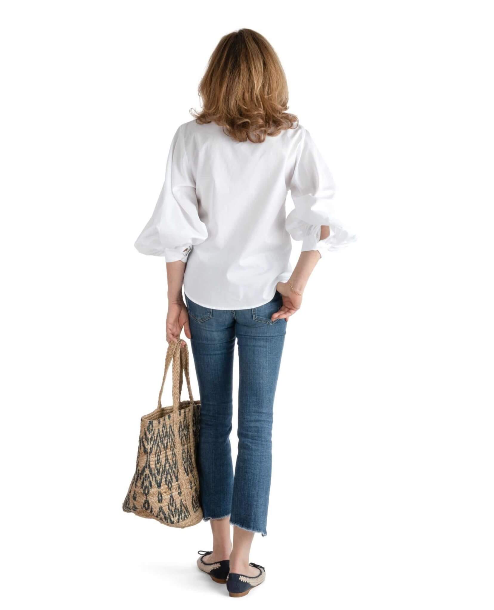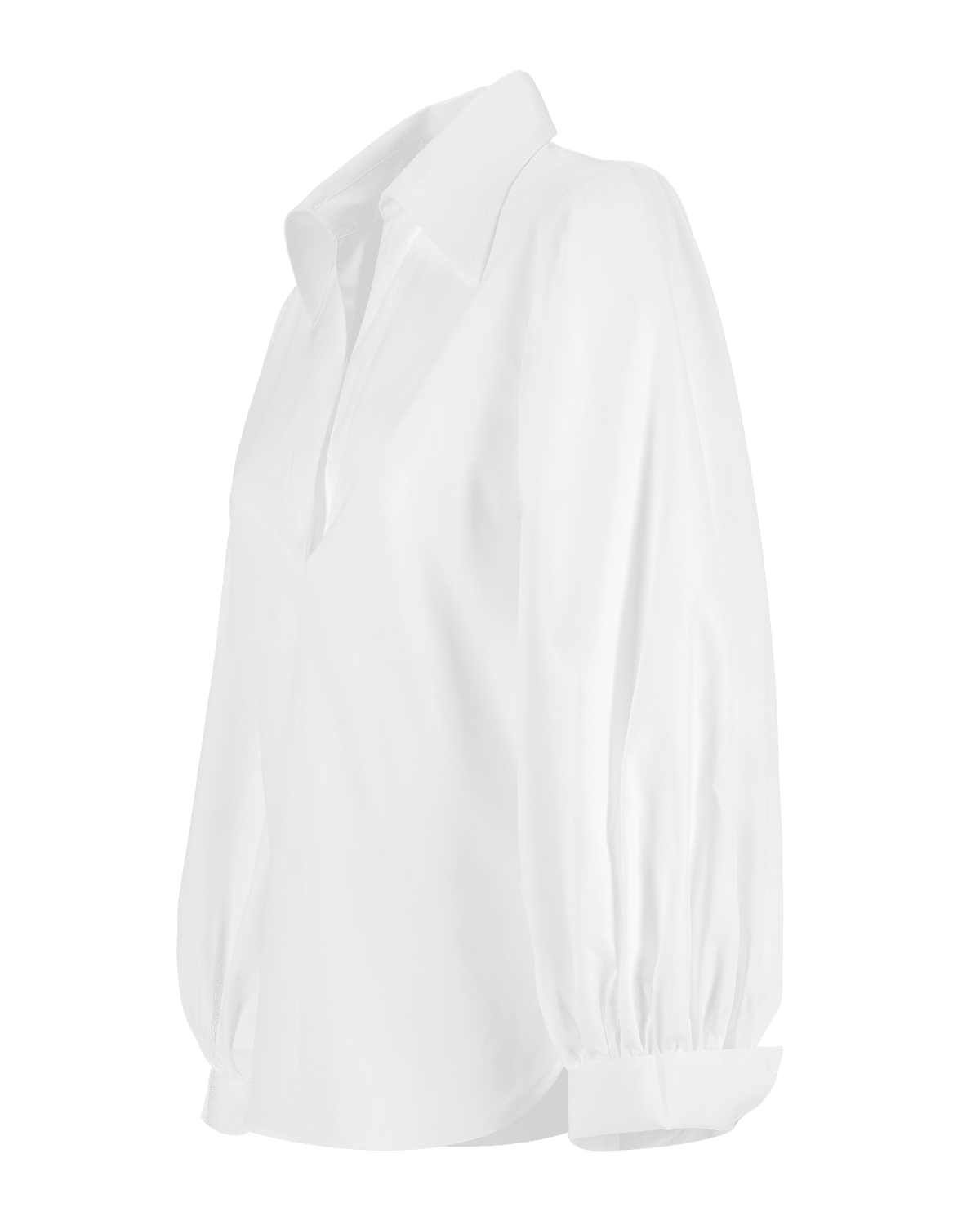 With its straight cut and voluptuous sleeves, the Sophie shape reinterpreted the classic white shirt. The volumes contrast and offer the singular simplicity that we love. Its deep-V neck and voluminous sleeves add a touch of soft femininity.
